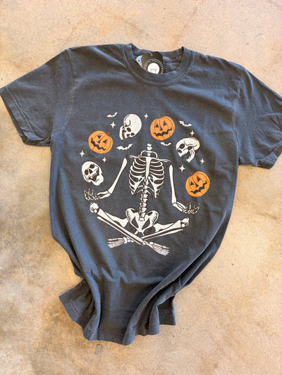 Celebrate spooky season with the Juggling Skeleton Tee! This playful graphic tee features a charming skeleton effortlessly juggling pumpkins and candy, bringing Halloween fun to your wardrobe. Comfortable and cute, it’s perfect for parties, trick-or-treating, or cozy fall days. Add a touch of whimsy to your holiday style with this lively design that’s sure to bring smiles wherever you go.